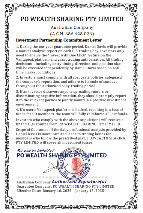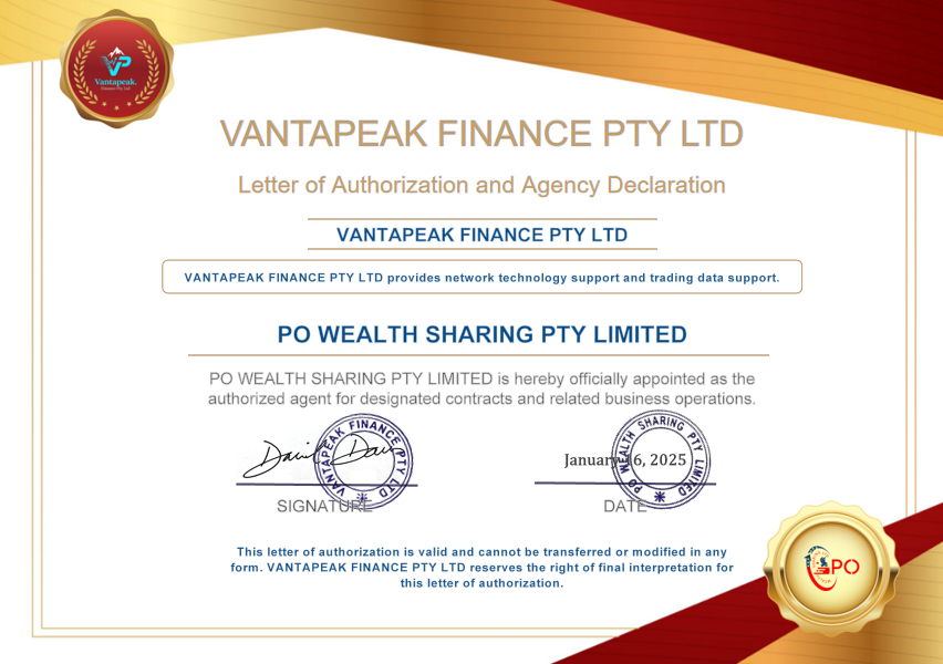 PO Wealth Sharing Group and its strategic partner Vantapeak Finance are licensed by ASIC. In addition, PO Wealth Sharing Group has secured regulatory permission to operate in multiple regions worldwide. We ensure that all operations are transparent, secure, and stable, providing clients with reliable and trustworthy investment protection.