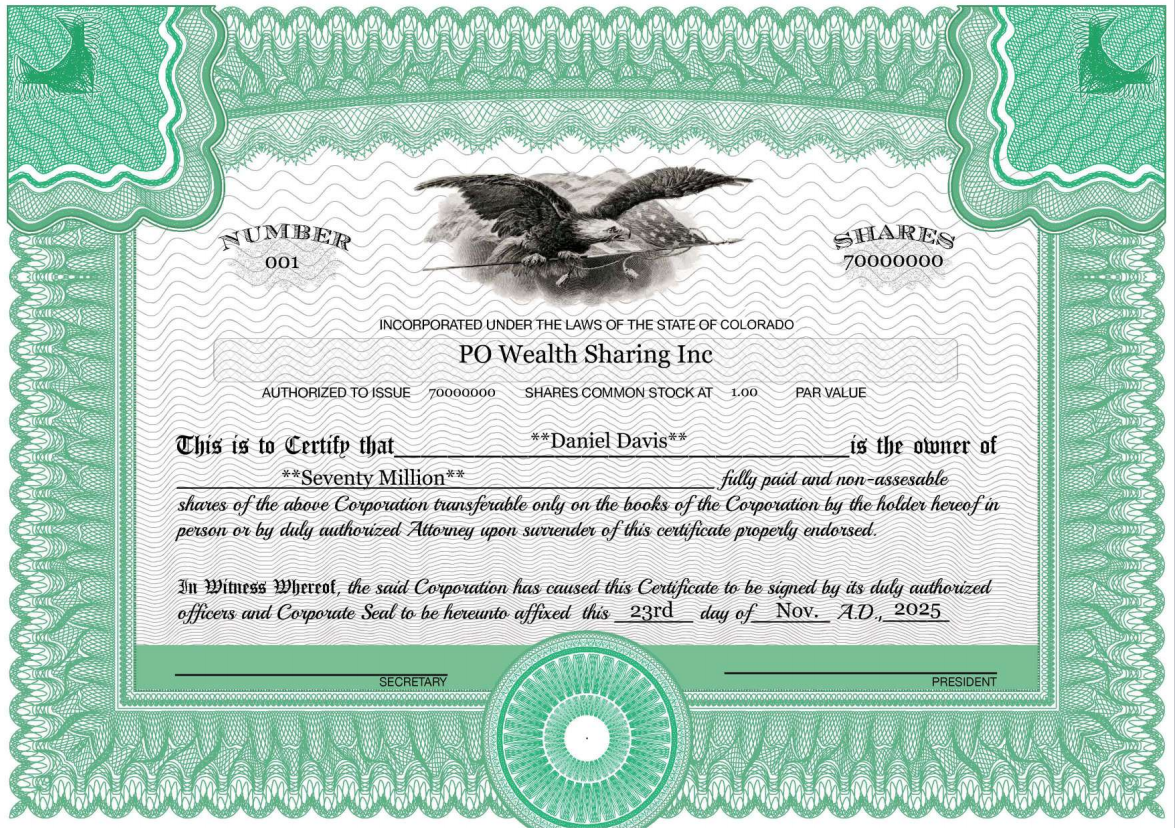 PO Wealth Sharing Inc., stock certificates