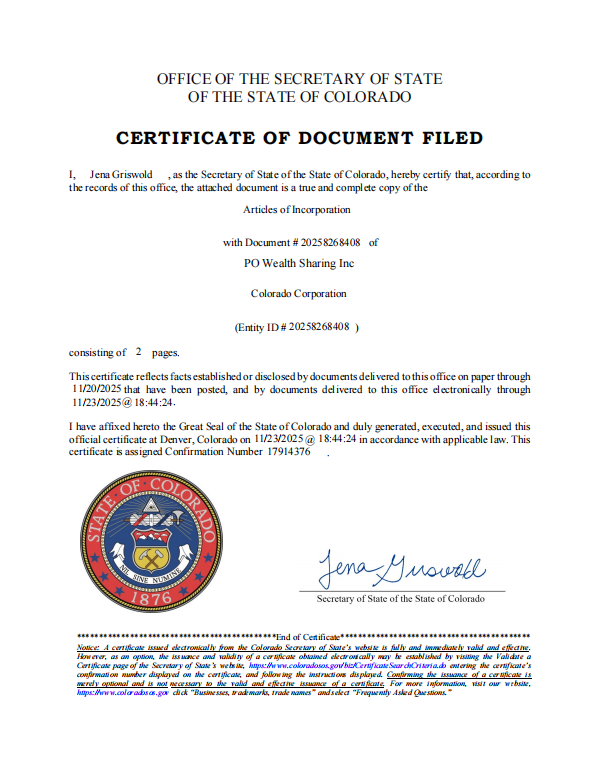 PO Wealth Sharing Inc. Registration Certificate